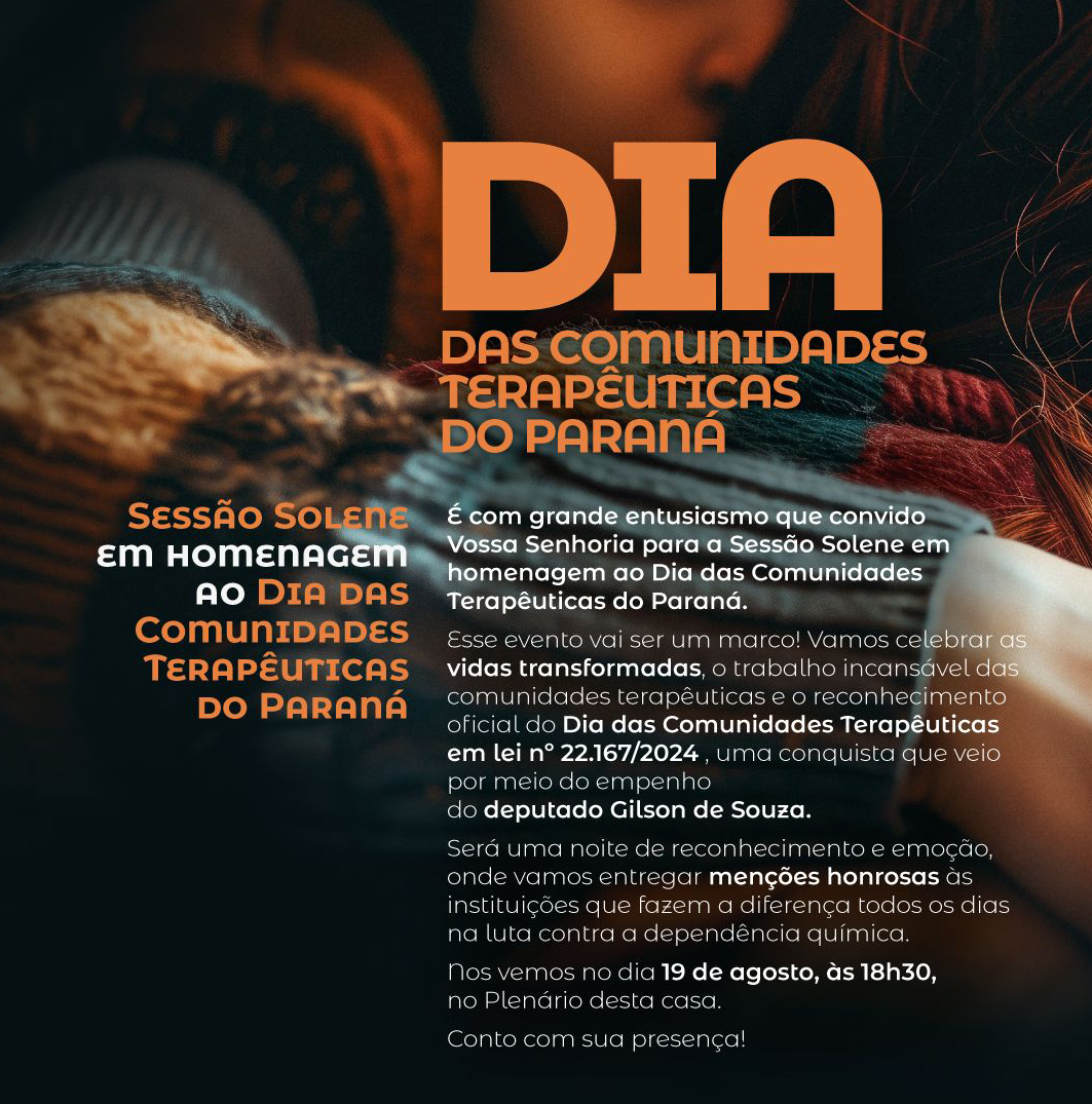 A Assembleia Legislativa do Paraná (Alep) realizará, no próximo dia 19 de agosto, uma sessão solene em comemoração ao “Dia das Comunidades Terapêuticas”. A iniciativa é da Frente Parlamentar em Apoio às Comunidades Terapêuticas, Cuidados e Prevenção às Drogas, coordenada pelo deputado estadual Gilson de Souza (PL), em parceria com a COMPACTA – Comunidades Terapêuticas Associadas do Brasil.