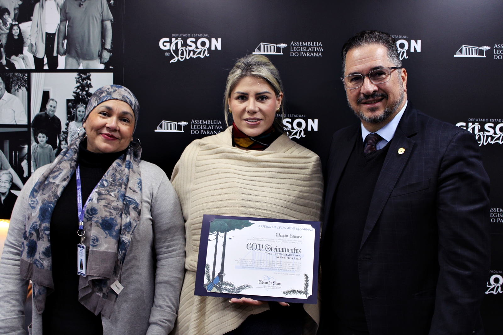 Na tarde desta terça-feira (1º), o deputado estadual Gilson de Souza (PL) recebeu no gabinete parlamentar, na Assembleia Legislativa do Paraná (Alep), a visita da empresária e pastora Jeane Leite da Silva Canelas. O encontro foi marcado por um ato solene de entrega de Menção Honrosa em reconhecimento à sua trajetória como empreendedora paranaense e sua relevante atuação no setor de eventos e treinamentos.