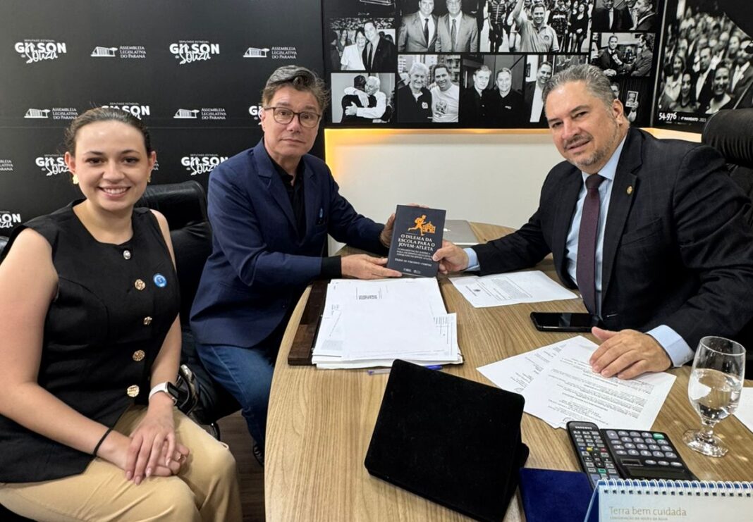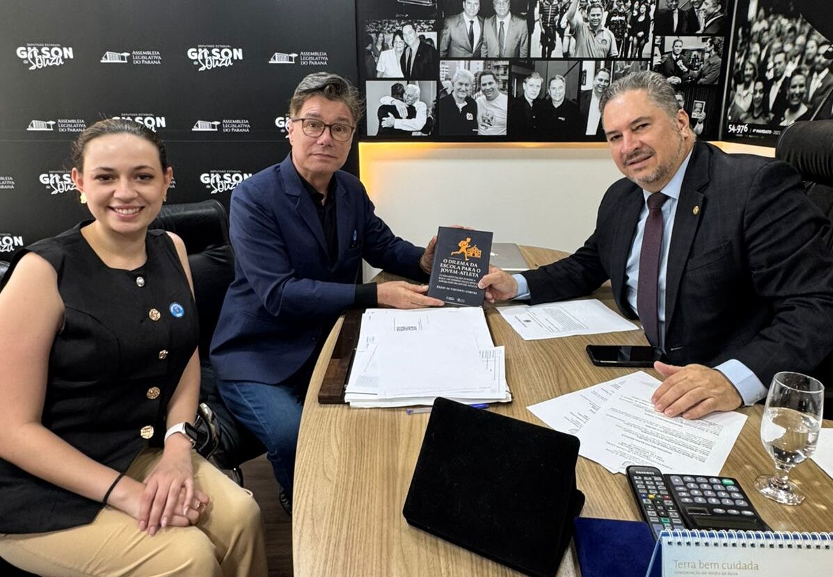 O deputado estadual Gilson de Souza (PL) recebeu, nesta segunda-feira (08), em seu Gabinete Parlamentar na Assembleia Legislativa do Paraná (Alep), a visita de Maria Eduarda Carvalho e o Dr. Fábio Di Visconti-Cortez, que apresentaram pautas voltadas ao fortalecimento de políticas públicas de inclusão e incentivo a jovens atletas do Estado.