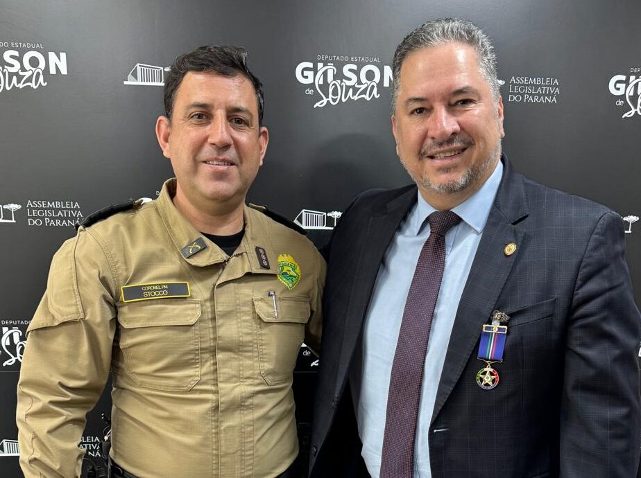 O deputado estadual Gilson de Souza (PL) recebeu, nesta segunda-feira (08), uma homenagem especial do 4º Comando Regional de Polícia Militar (4º CRPM), sediado em Ponta Grossa. Durante ato solene realizado em seu gabinete na Assembleia Legislativa do Paraná (Alep), o parlamentar foi agraciado com a “Medalha Guardiões dos Campos Gerais”, entregue pelo comandante do 4º CRPM, coronel Cristiano Stocco Rosa.