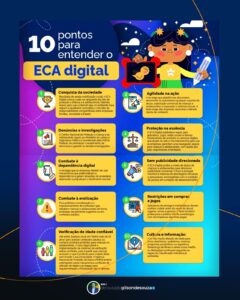 Outro ponto relevante é o estímulo à educação digital, com incentivo à conscientização de pais, responsáveis e escolas sobre os riscos da internet, incluindo práticas como cyberbullying, aliciamento virtual e o uso indevido de tecnologias como inteligência artificial.